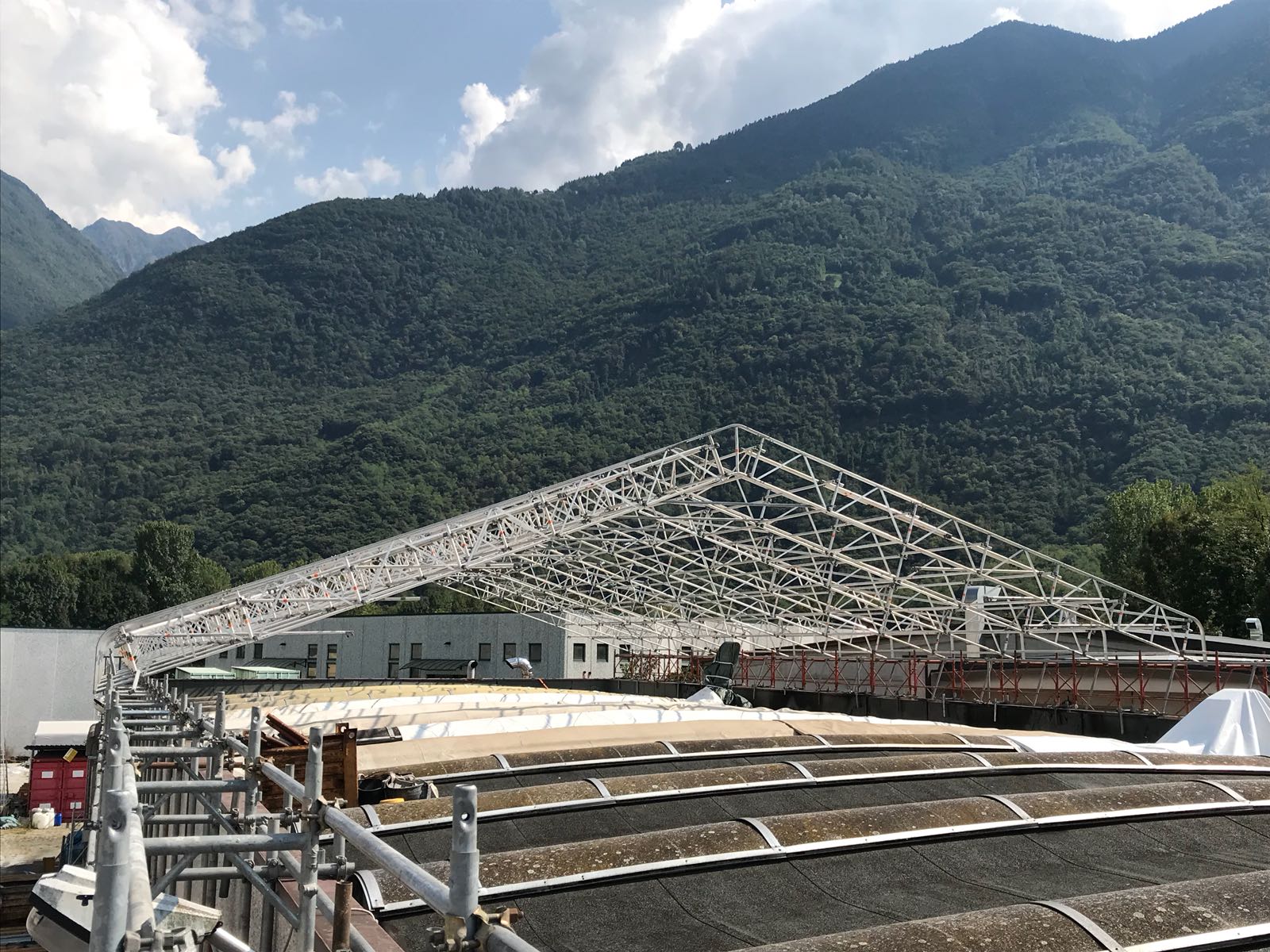 La Copertura a Padiglione è una struttura autoportante, costituita da tralicci orizzontali e verticali progettata per fornire un’involucro PROTETTIVO COMPLETO. Utilizzata nei più svariati ambiti, dalla copertura di piscine alla realizzazione di CAPANNONI in ambito logistico o di EVENTI nel settore dello spettacolo.
