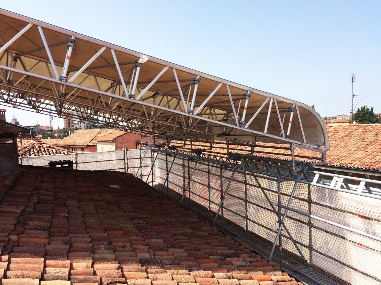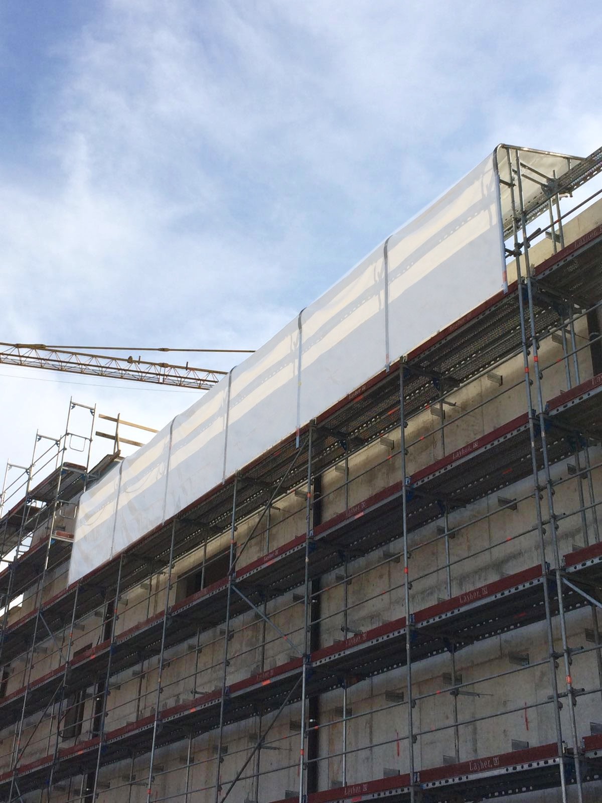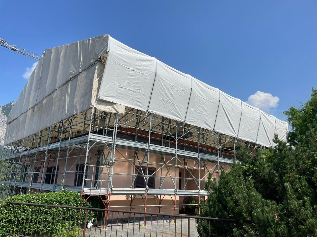 Grazie a guide in alluminio e teli in PVC ad alta resistenza, realizziamo Coperture di Facciata ancorate direttamente all’impalcatura, garantendo protezione da pioggia, vento e freddo durante tutte le fasi di lavoro. La protezione può estendersi fino alla gronda dell’edificio, assicurando un ambiente di cantiere asciutto e sicuro.